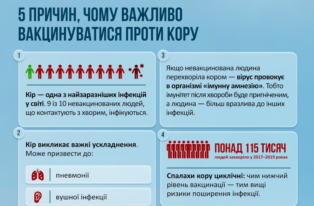 Кір — одна з найзаразніших інфекцій у світі. 9 із 10 невакцинованих людей, що контактують з хворим, інфікуються. Підхопити збудник можна будь-де: від громадського транспорту до магазину, навчального закладу, укриття.