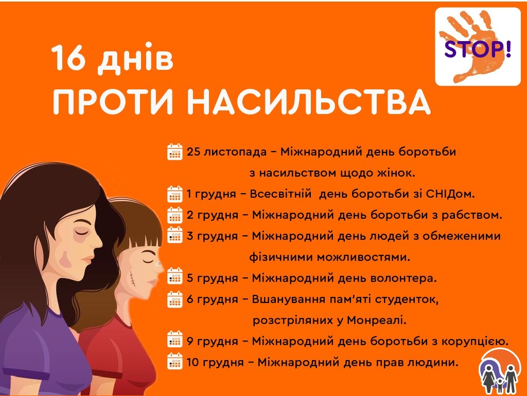 З 25 листопада по 10 грудня в Україні розпочинається щорічна акція "16 днів проти насильства". Цей період є часом для об'єднання наших зусиль у боротьбі з проблемою, яка залишається однією з найгостріших у нашому суспільстві.