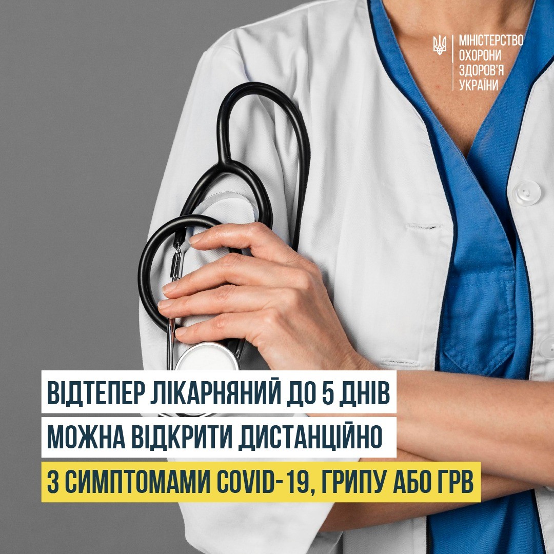 Відтепер пацієнти з симптомами COVID-19, грипу або ГРВІ зможуть в окремих випадках відкривати лікарняний дистанційно. Лікар зможе формувати медичні висновки про тимчасову непрацездатність без особистого прийому, на підставі віддаленого зв’язку з пацієнтом і вказаних ним симптомів.