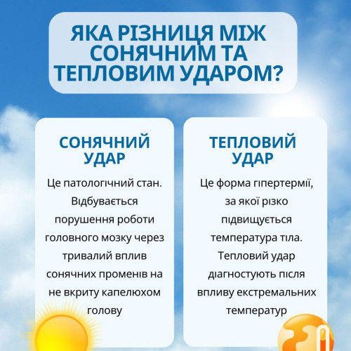 ТЕПЛОВИЙ УДАР - це форма гіпертермії, за якої різко підвищується температура тіла. Він може бути спричинений як довготривалим перебуванням у приміщенні з високими температурами, так і надмірною фізичною активністю, під час якої організм виділяє багато тепла, але не може забезпечити його відведення належним чином.
