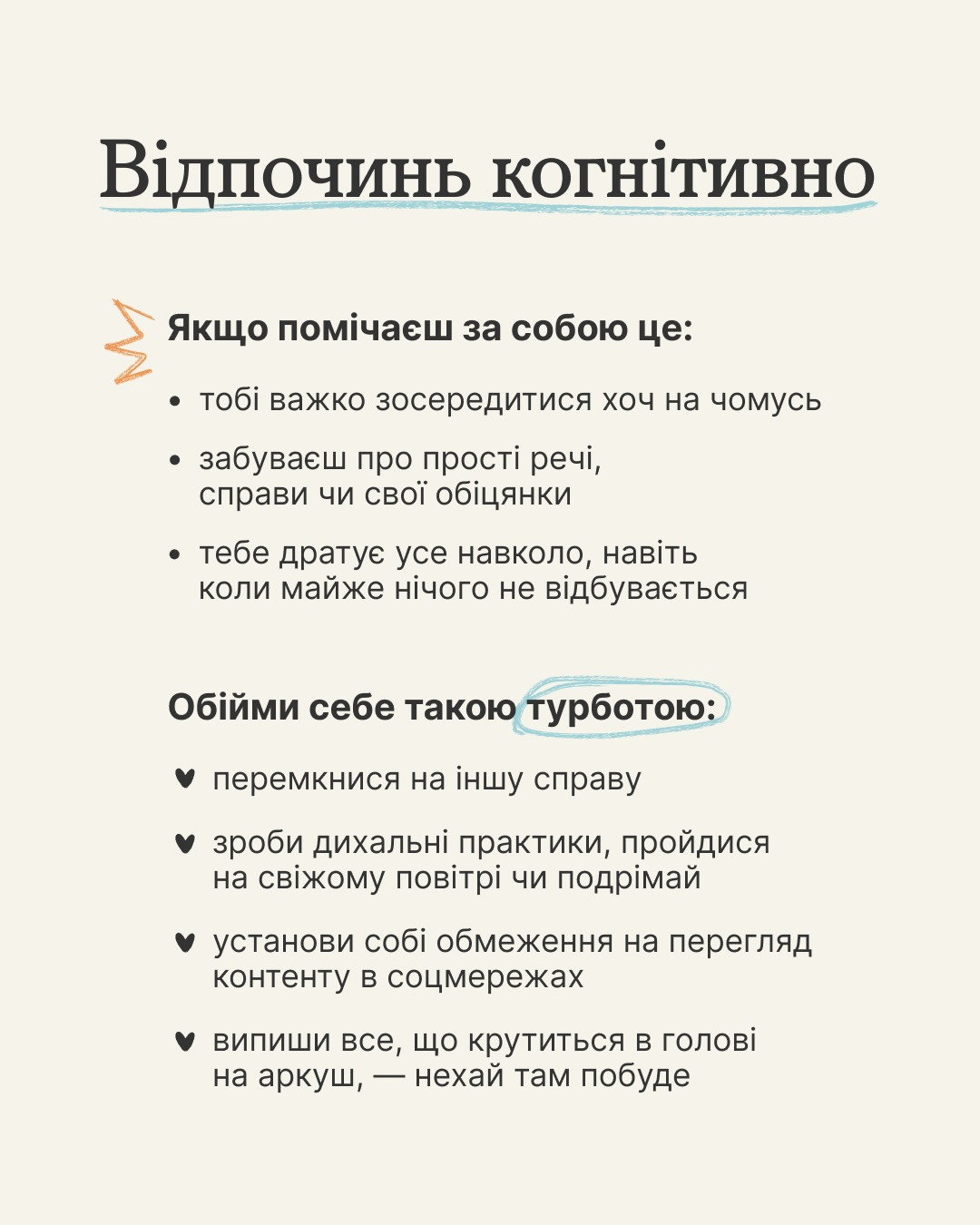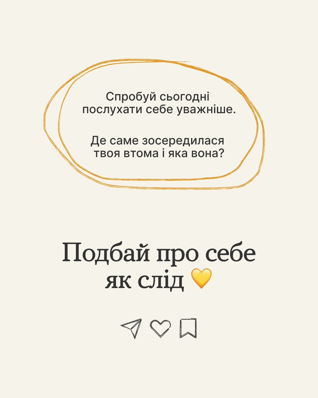 Втома буває різною: фізичною, емоційною, розумовою. Кожна з них потребує свого підходу. Всеукраїнська програма ментального здоров’я за ініціативою Олени Зеленської «Ти як?» підготувала карусель із трьома типами втоми та простими способами, які допоможуть відновитися по-справжньому.