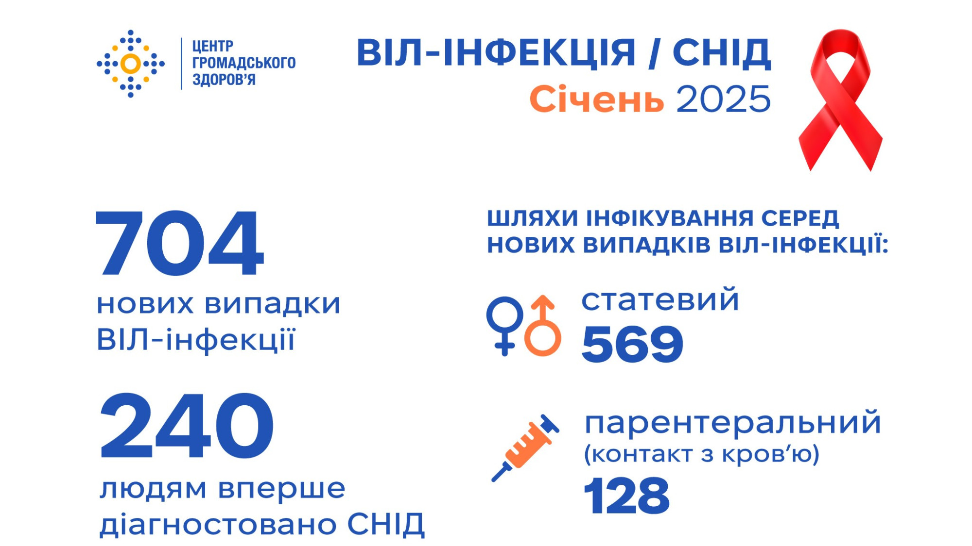 У січні 2025 року в Україні офіційно зареєстровано 704 нових випадки ВІЛ-інфекції, у 240 пацієнтів вперше діагностовано СНІД, 77 людей померли від хвороб, зумовлених СНІДом.