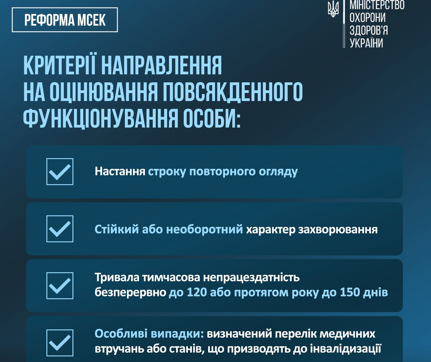З 1 січня 2025 року в Україні запрацює нова система оцінювання повсякденного функціонування особи. Замість медико-соціальних експертних комісій (МСЕК) оцінювання будуть проводити експертні команди лікарів-практиків у лікарнях.