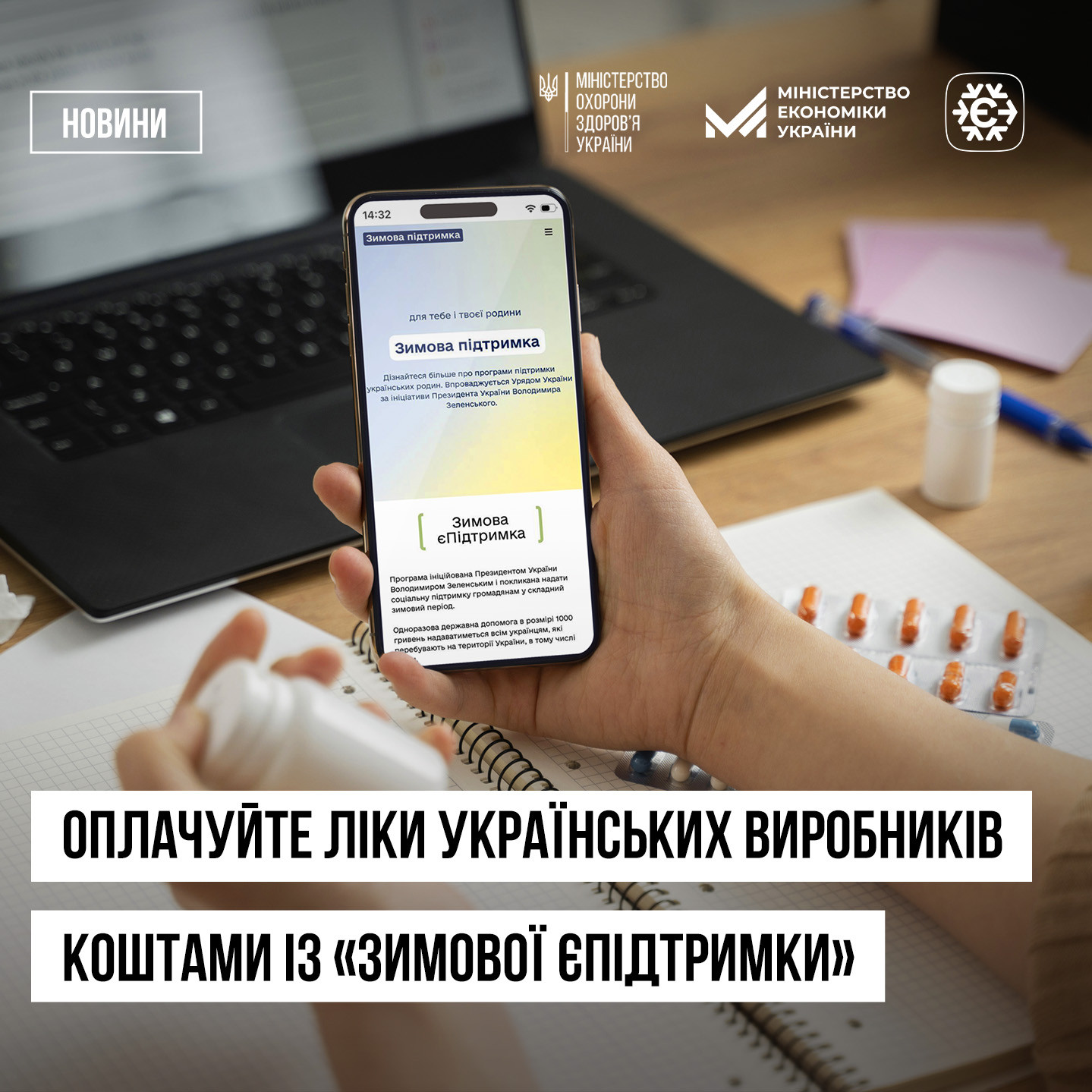 Українці можуть придбати необхідні медичні препарати вітчизняного виробництва за кошти державної програми «Зимова єПідтримка». Про це повідомило Міністерство охорони здоровʼя України. За ініціативою Президента України, кожен громадянин, який проживає на підконтрольній території, має можливість отримати 1000 гривень на придбання важливих товарів та послуг.