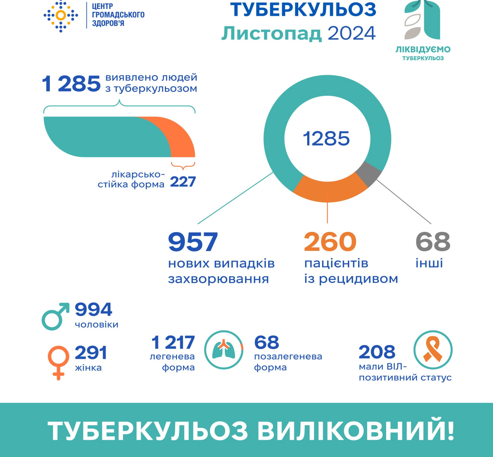 Згідно інформації Центру громадського здоровʼя України у листопаді 2024 року виявлено 1 285 людей з туберкульозом.Зокрема 957 нових випадків захворювання та 260 пацієнтів із рецидивом, а також 68 інші.