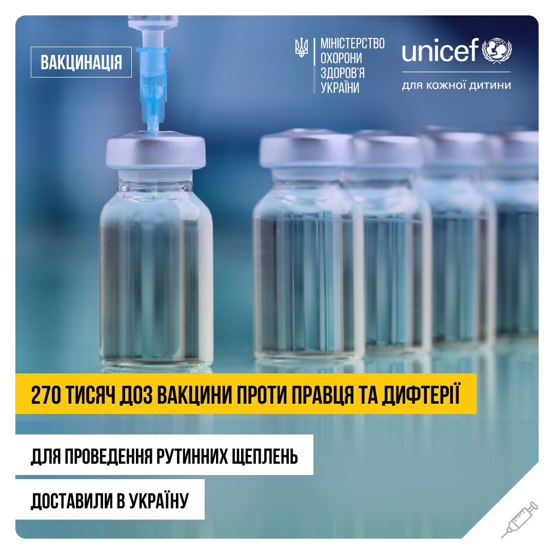 270 тисяч доз вакцини проти правця та дифтерії доставив в Україну Дитячий Фонд ООН ЮНІСЕФ (UNICEF Ukraine).