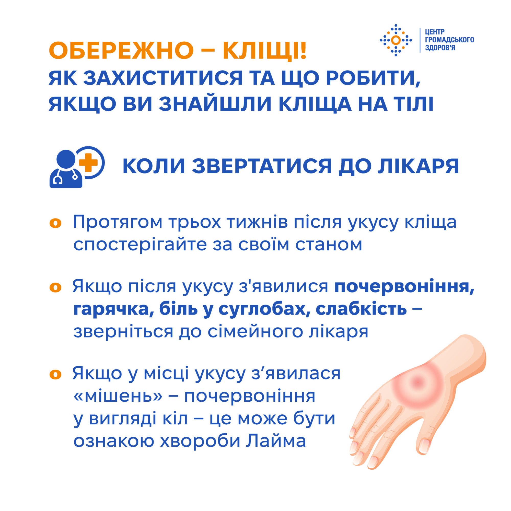Хвороба Лайма може починатися з почервоніння на місці укусу кліща, схоже на мішень (червоні кола), головного болю, млявості, болю в тілі. Якщо її не лікувати на ранній стадії — це може призвести до ураження шкіри, суглобів, серця, нервової системи й навіть до інвалідності.