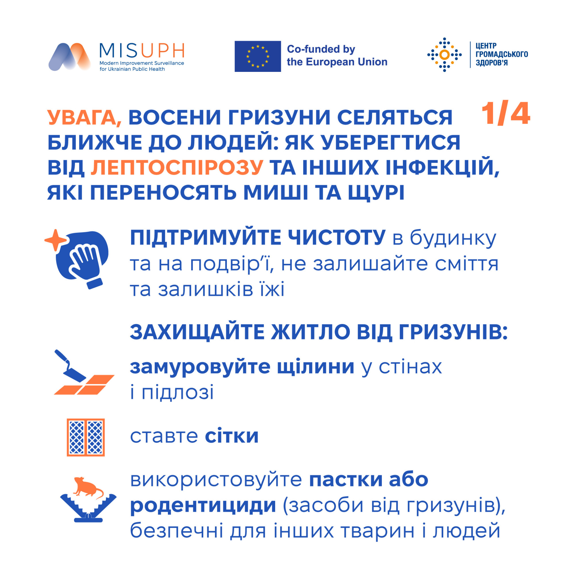 Регулярно проводьте дератизацію приміщень та зберігайте продукти в щільно закритих контейнерах.