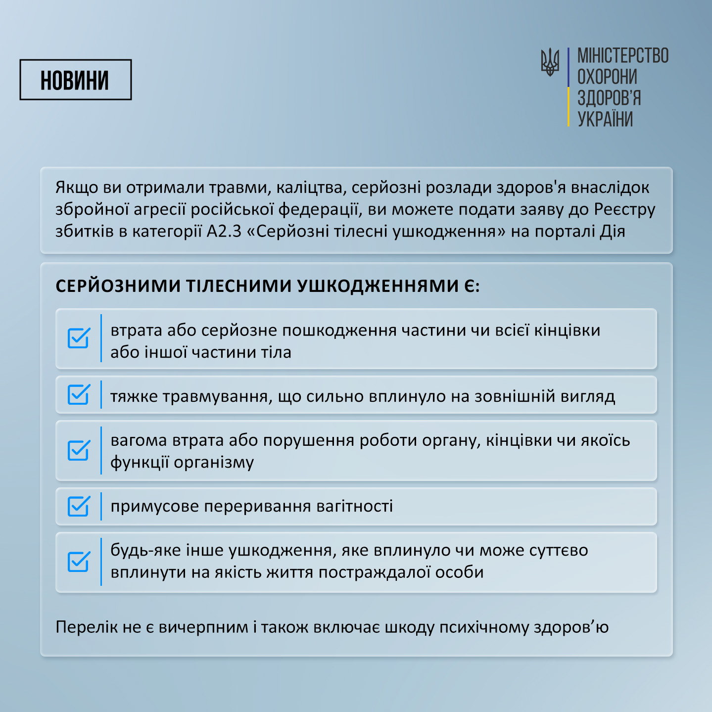 На платформі Дія представлені 13 типів заяв про військові збитки. П'ять категорій стосуються здоров'я людини: