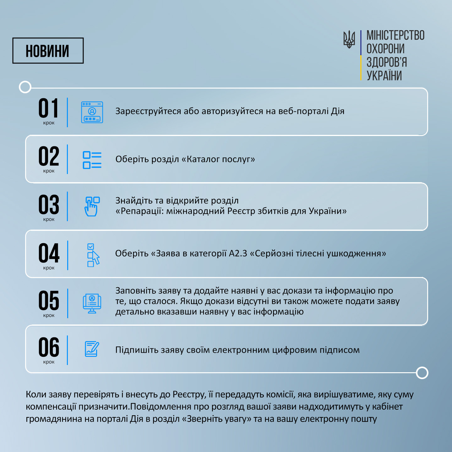 Якщо ви або члени вашої родини постраждали від воєнної агресії росії - отримали фізичні чи психологічні травми, зазнали ушкоджень здоров'я, пережили знущання, перебували у незаконному ув'язненні або зазнали тортур - ви можете подати заяву про репарації до міжнародного Реєстру збитків для України (RD4U) через платформу Дія.