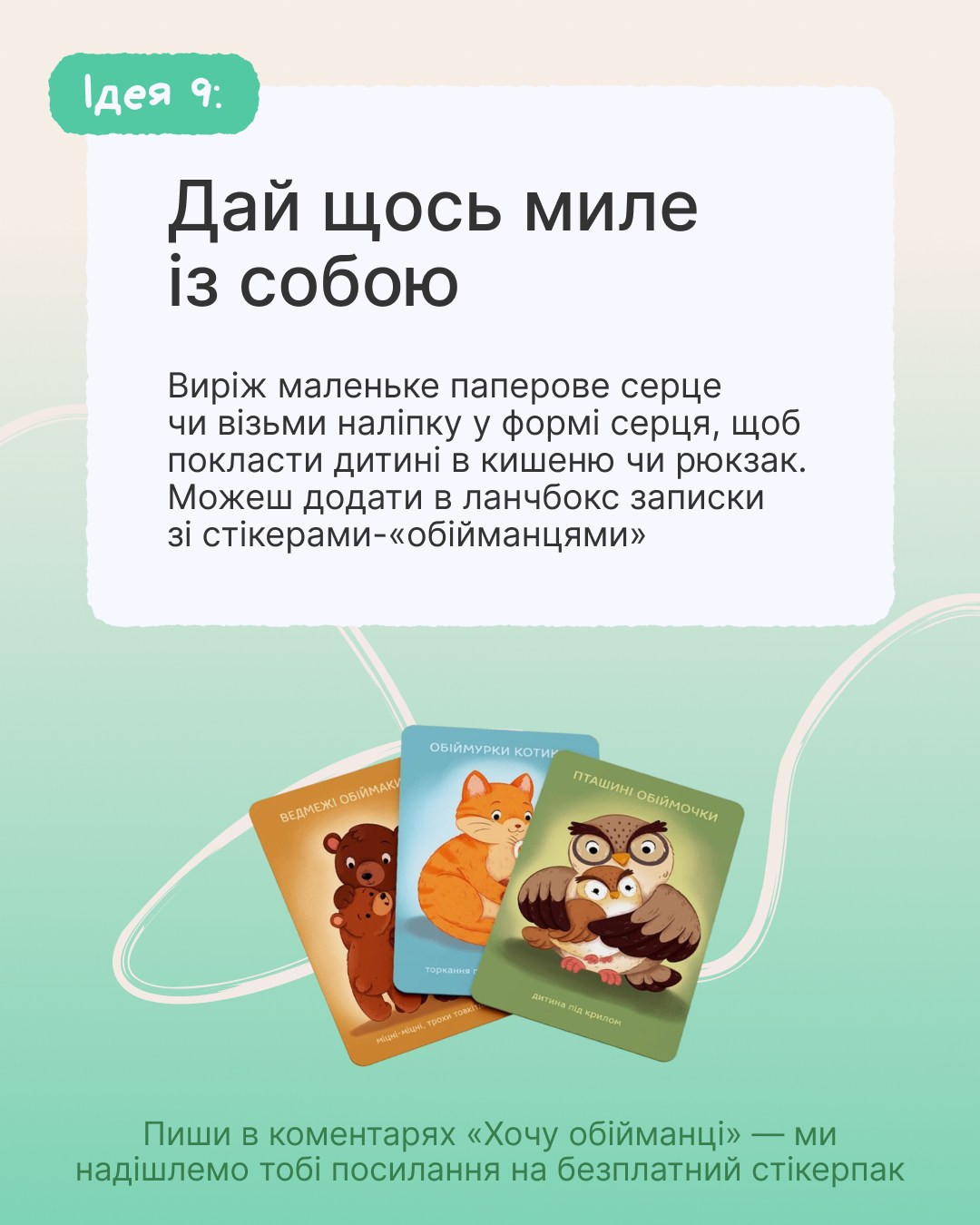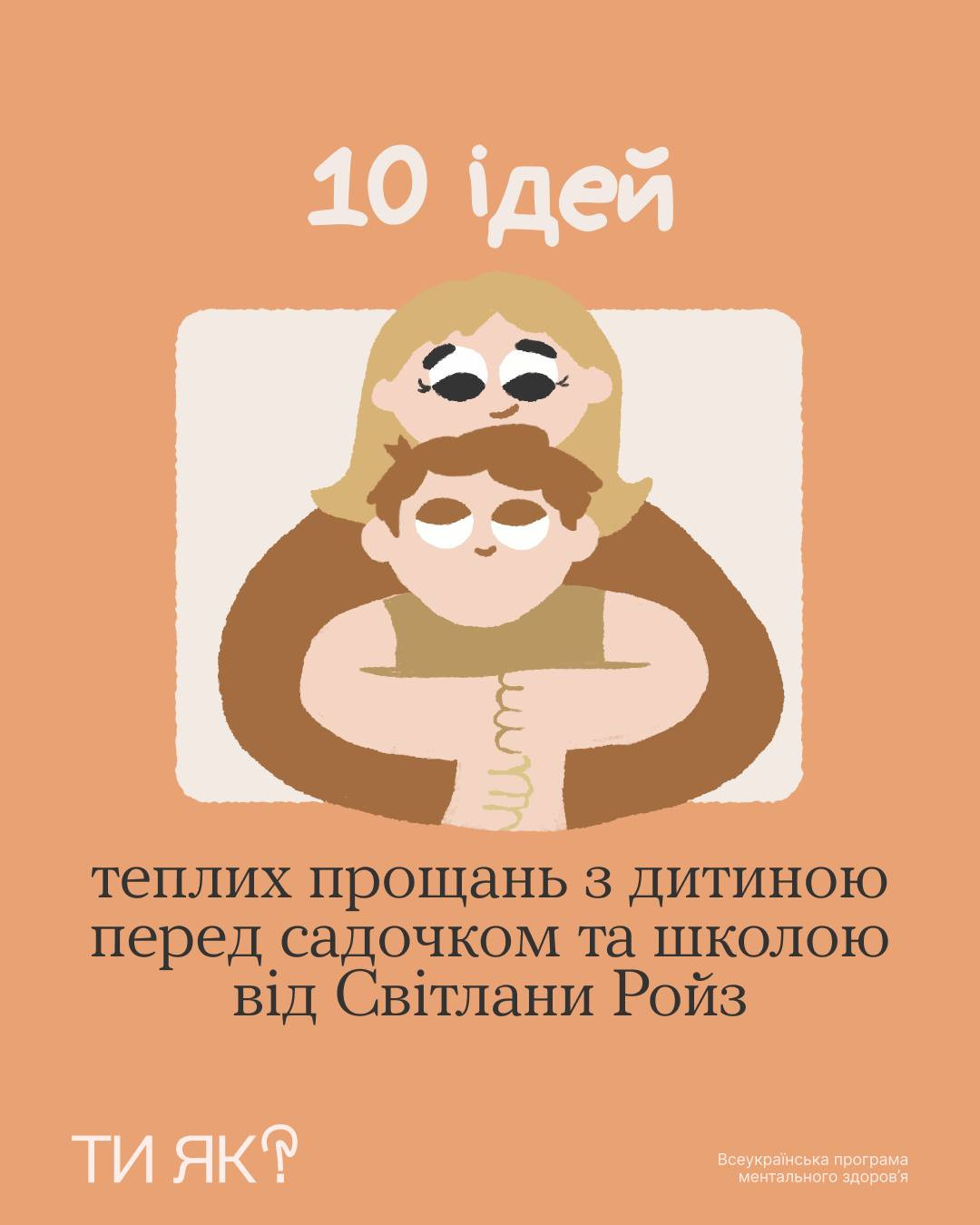 Неможливо бути поруч із дитиною постійно, особливо коли вона у дитячому садку чи школі. Але вашу підтримку можна вкласти у невеликі жести, традиції та предмети, які малюк візьме з собою. Разом із психологинею Світланою Ройз команда "Ти як" розробила практичні ідеї "теплих" прощань перед садочком та школою.