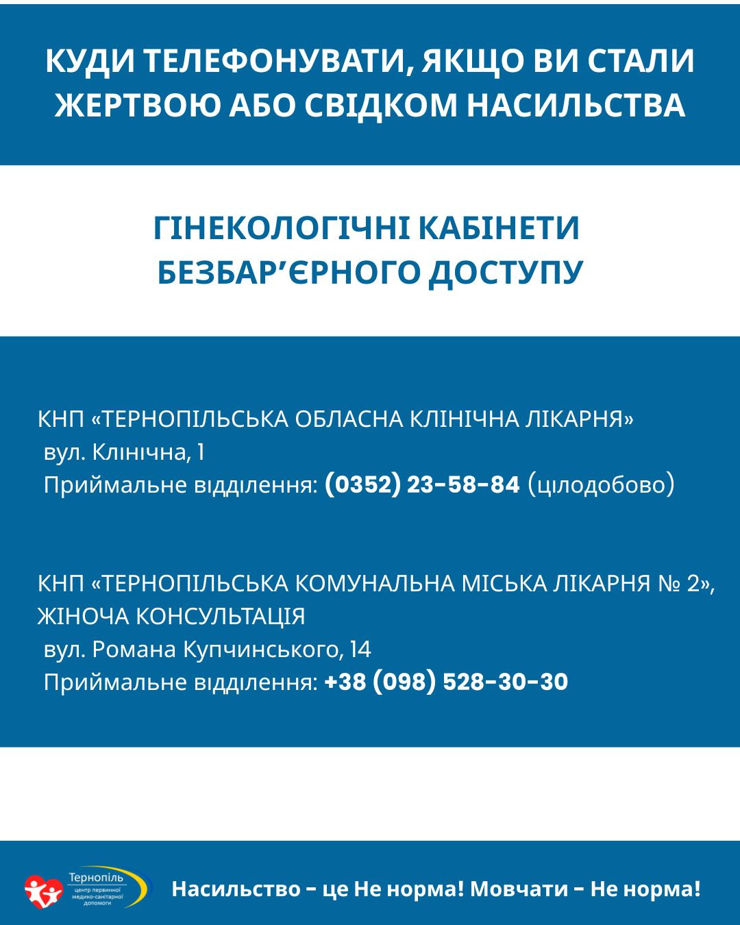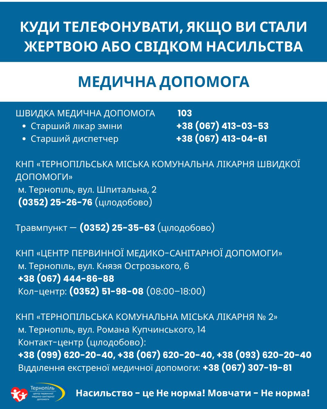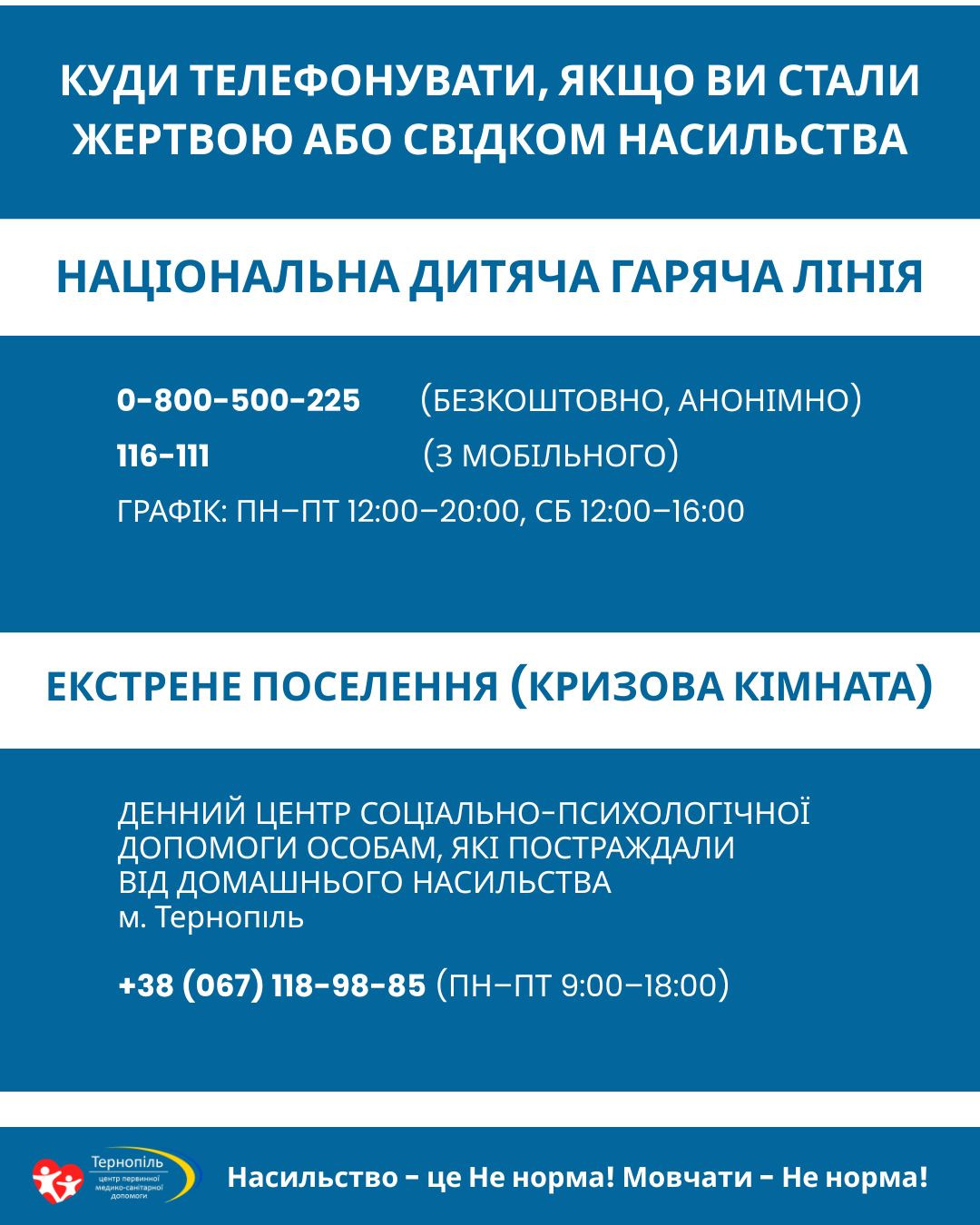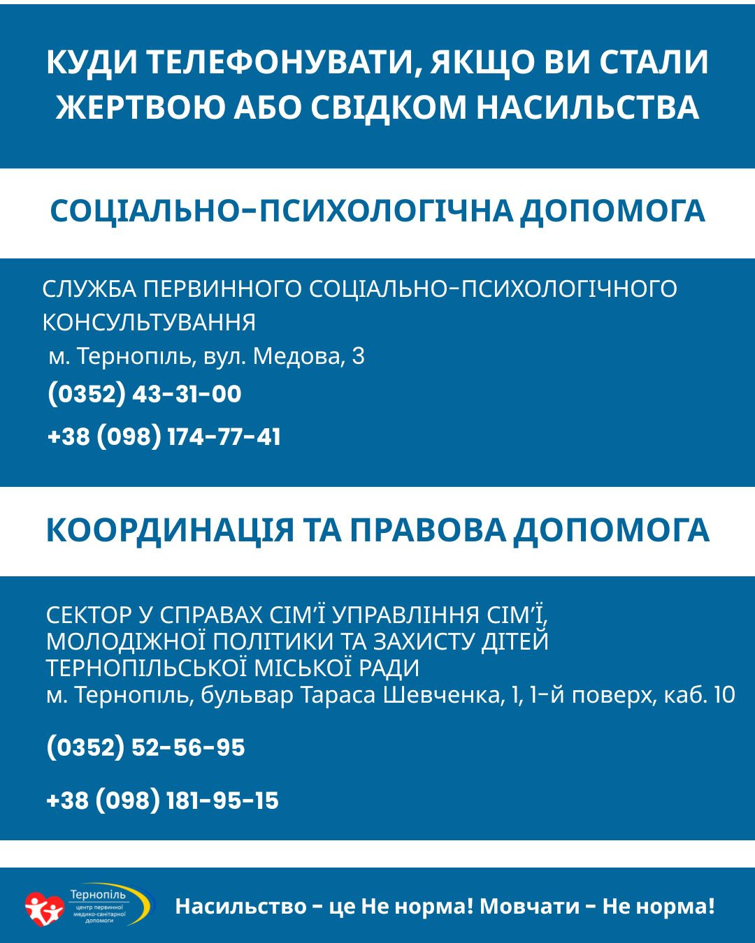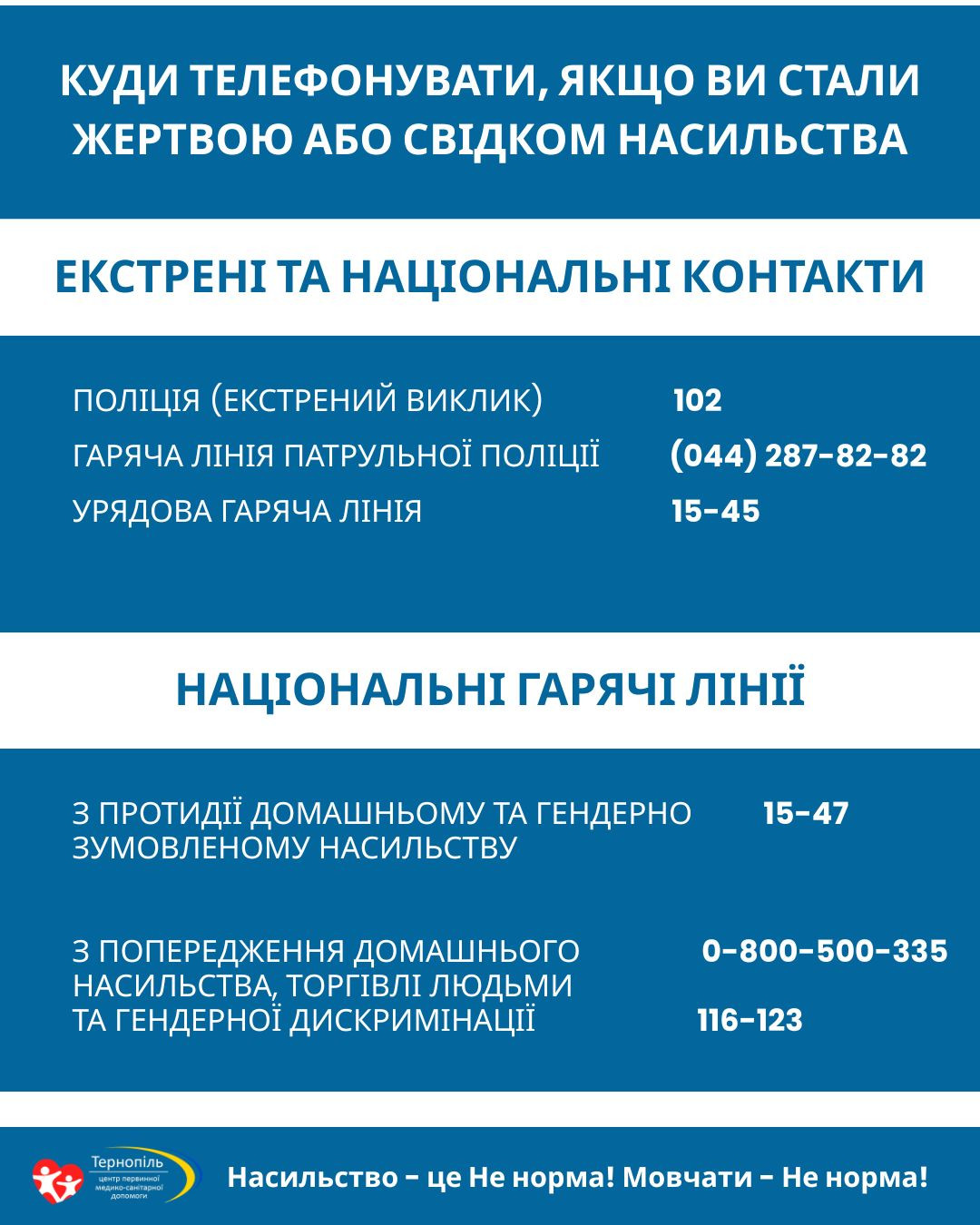 Якщо ви стали жертвою насильства або свідком такого поводження з іншими звертайтесь за допомогою. Ось перелік важливих контактів куди можна телефонувати, зокрема в Тернополі.