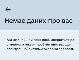 Текст: Ми не знайшли ваші дані. Зверніться до сімейного лікаря, щоб він вніс вас до електронної системи охорони здоров'я |