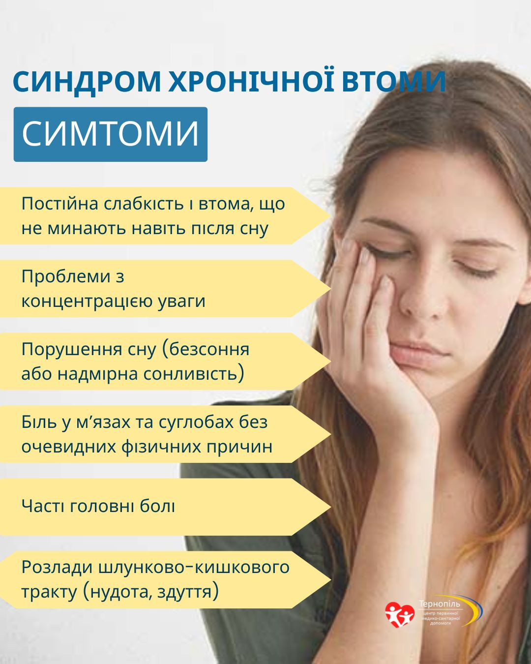 Ви спите 7-8 годин, але прокидаєтесь розбитим. Немає сил на звичайні справи. Відпочинок не допомагає — втома не зникає ні після вихідних, ні після відпустки. Це синдром хронічної втоми. Звичайна втома минає після відпочинку. Хронічна — ні. Вона тримається місяцями. Знижується працездатність, важко зосередитися, постійна слабкість. Це не лінь і не слабкість характеру. Це медичний стан, який потребує діагностики та лікування.