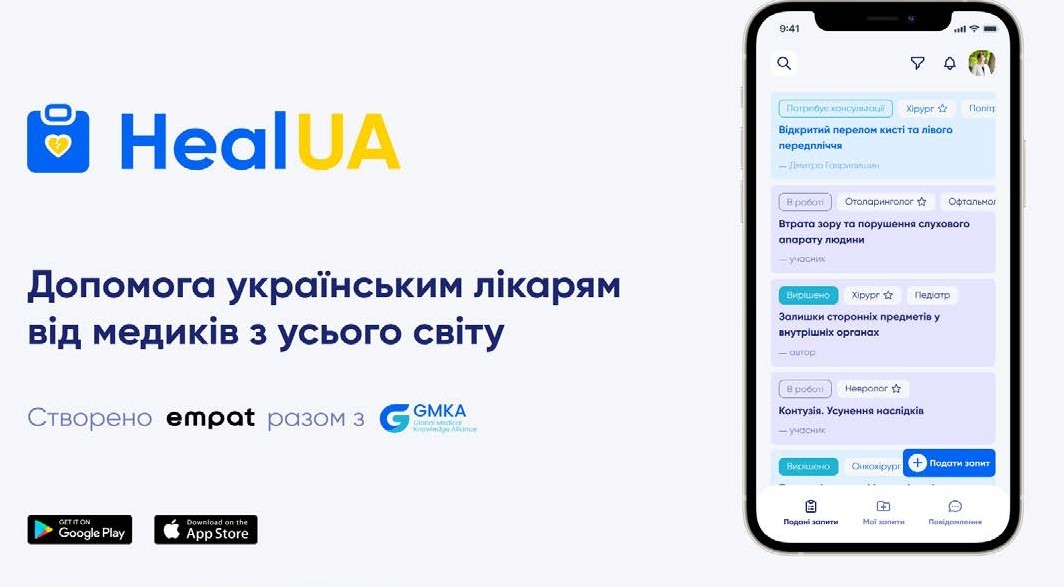 Стартап-студія Empat разом з міжнародною організацією Global Medical Knowledge Alliance (GMKA) запустили застосунок HealUA, у якому українські лікарі можуть отримати фахові консультації від своїх колег з усього світу. Ініціатива об’єднує медиків з України, яким зараз потрібна профільна допомога, та досвідчених лікарів з-за кордону, які готові її надати.