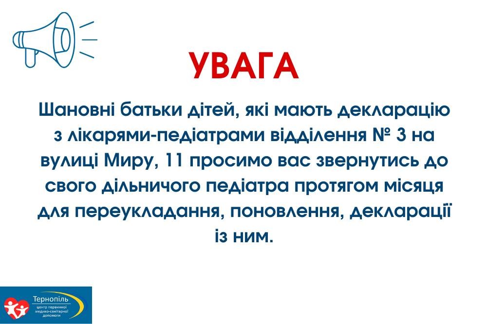 Шановні батьки дітей, які мають декларацію з лікарями-педіатрами відділення № 3 на вулиці миру, 11 просимо вас звернутись до свого дільничого педіатра протягом місяця для переукладання, поновлення, декларації із ним.