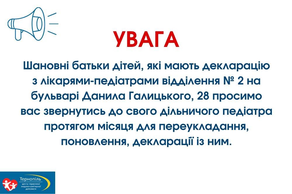 Тернополянам, які мають укладені декларації з лікарями-педіатрами відділення №2 на бульв. Данила Галицького, потрібно поновити декларації.